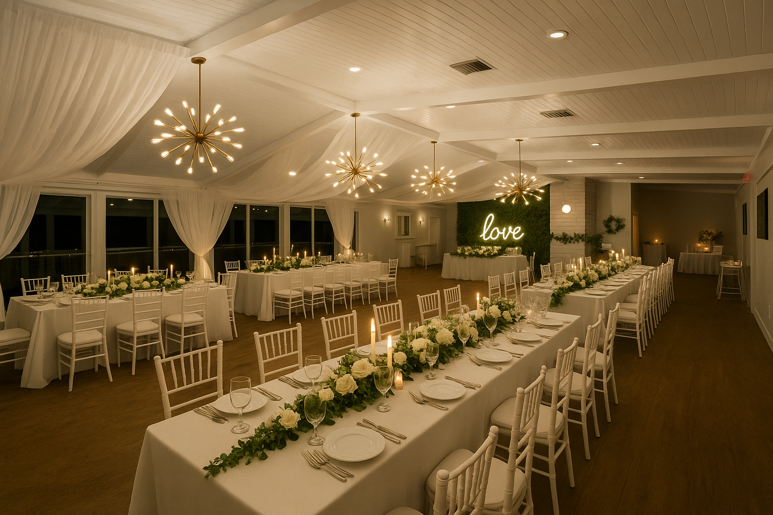 Nestled on our sister property, the marina in Apollo Beach, our elegant coastal venue offers sweeping water views, indoor-outdoor flexibility, and light-filled interiors — perfect for weddings, corporate gatherings, and private parties.